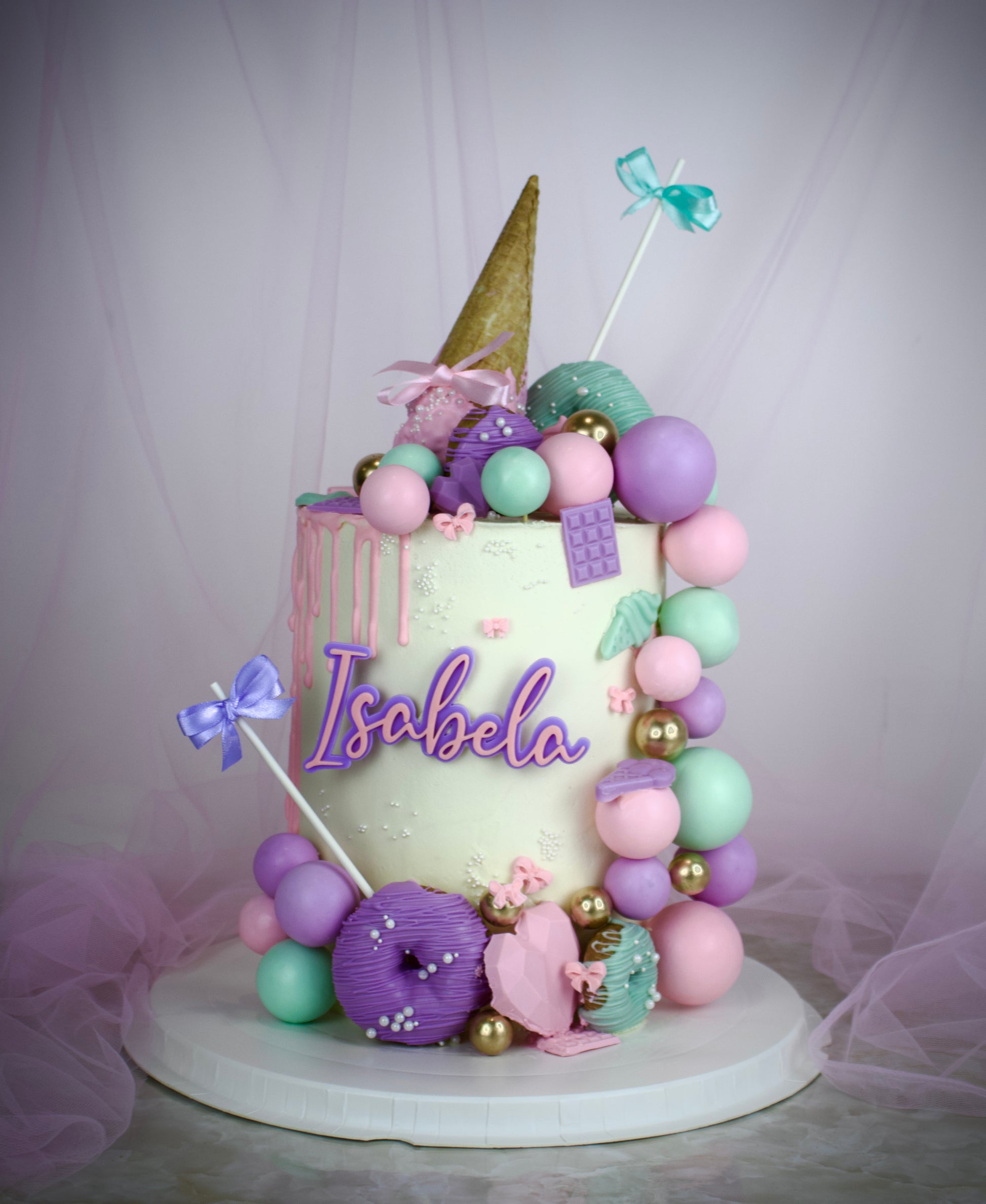 Cake decoration (pink drip, chocolates, spheres, bows, topper).